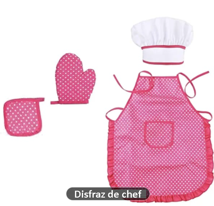 Inspira la creatividad de tu pequeña con este encantador conjunto de disfraz de chef infantil color rosado, ideal para juegos de cocina, fiestas temáticas o actividades escolares.