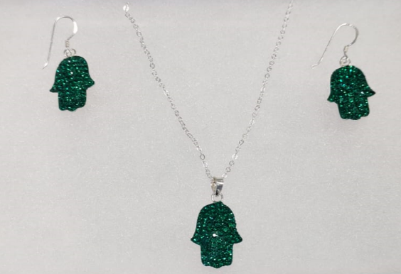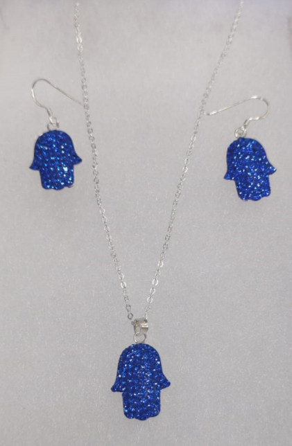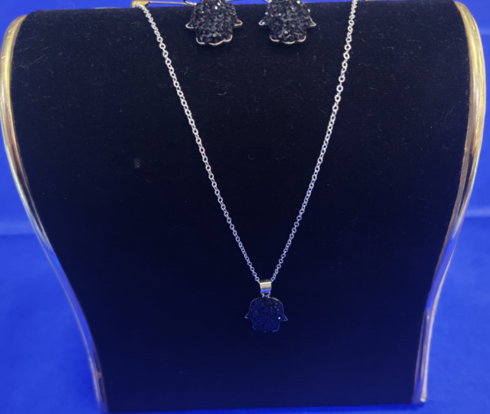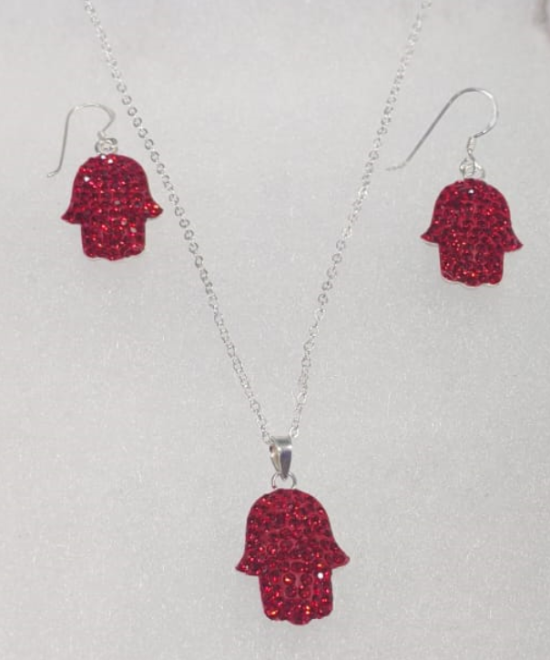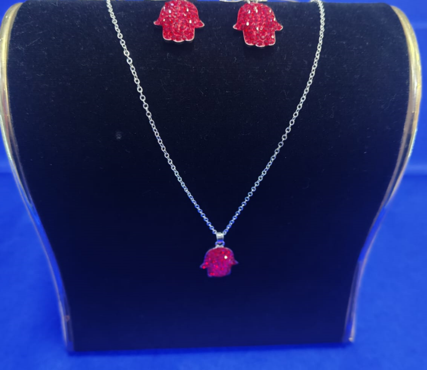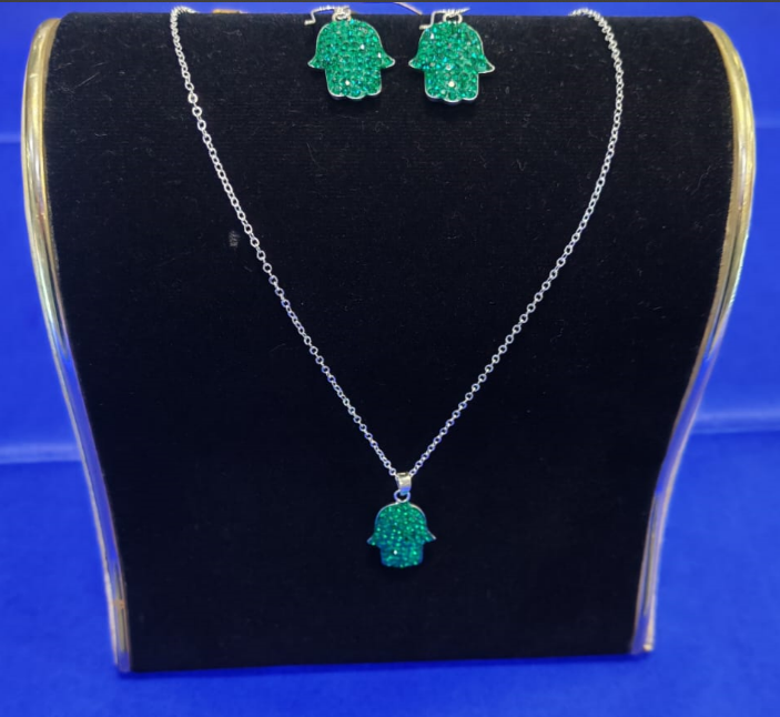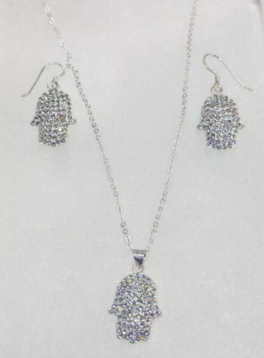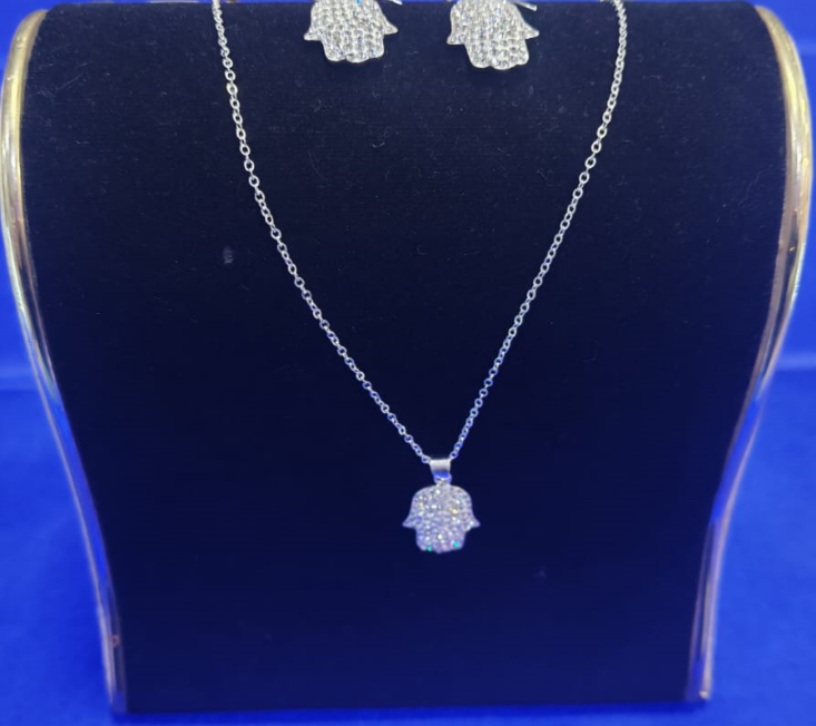 Elegante conjunto de joyería Mano Poderosa elaborado en plata ley 925, símbolo de protección y buena fortuna.